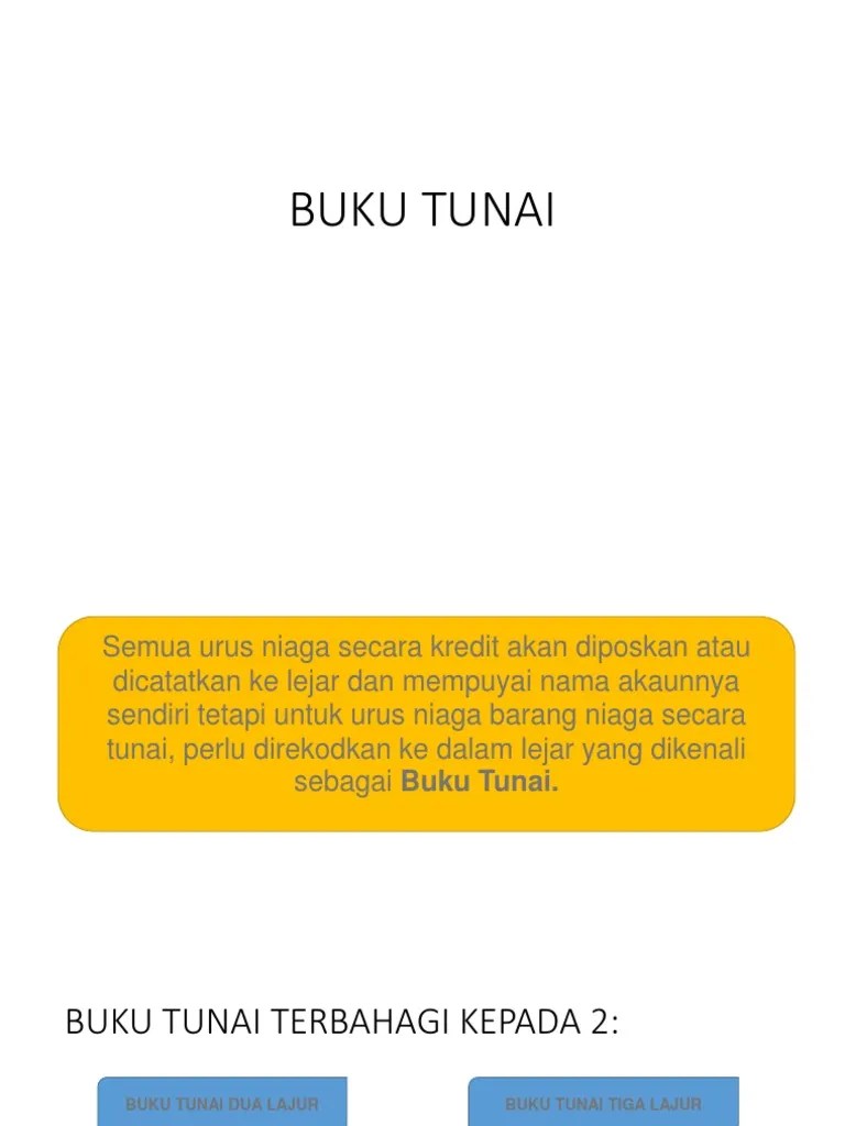 Buku tunai terbahagi kepada 2 jenis iaitu buku tunai dua lajur dan buku tunai tiga lajur.